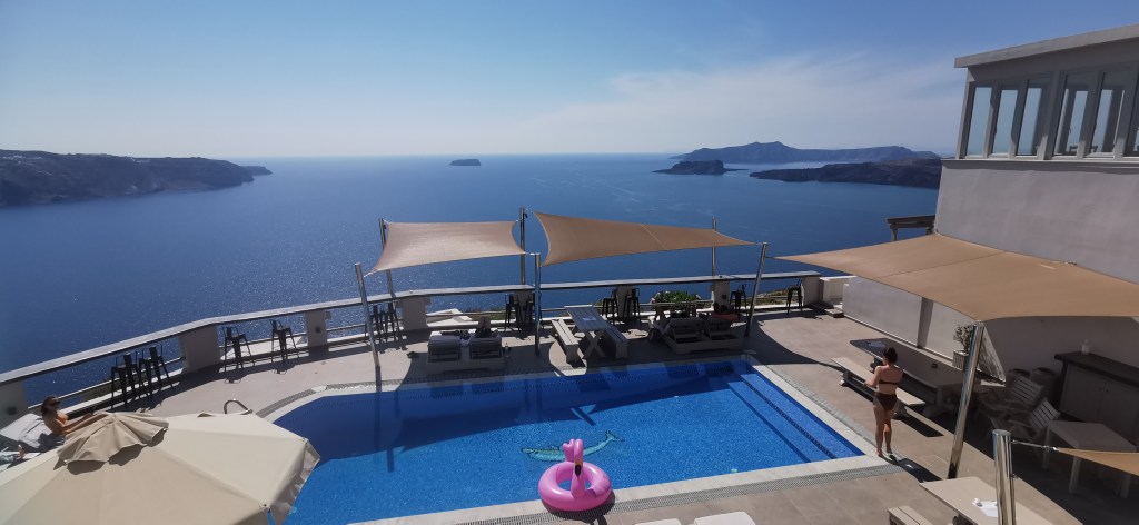 Nosotros nos alojamos en Megalochori, en el Gran View Hotel, un lugar espectacular que prometía en fotos pero que cuando llegamos nos dejó boquiabiertos.