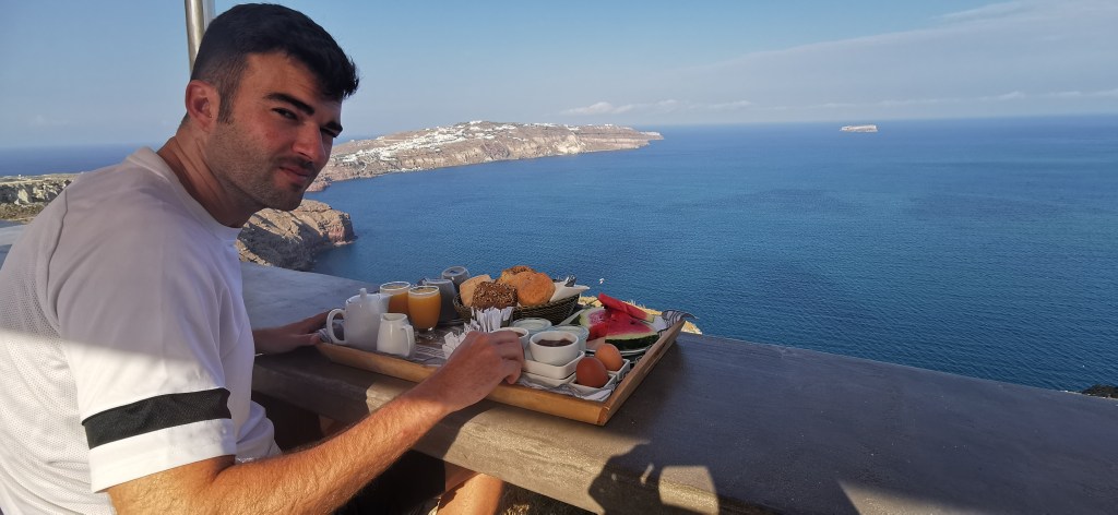 El desayuno al borde del acantilado con vistas a la caldera me parece un lugar idílico y, sinceramente, más íntimo que cualquiera de la mayoría de habitaciones que se ven por la redes . En Fira y Oia tendrás el paso de los turistas por el medio de los hoteles y sin embargo en este lugar, solamente estarás con los otros pocos huéspedes del hotel.