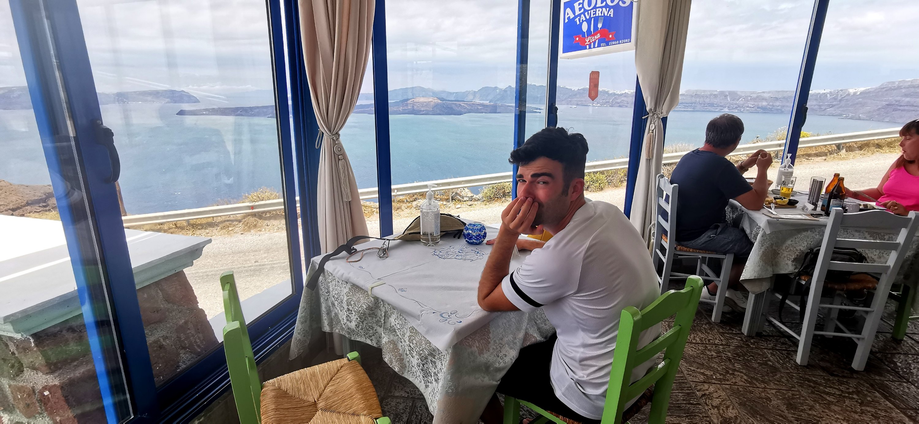 Cuenta con una preciosa terraza con vistas a la Caldera desde la que disfrutar del atardecer mientras cenas. En cuanto baja el sol, comienza a hacer algo se brisa y te dejan unas mantitas que os recomiendo no rechazar porque vienen de maravilla.
